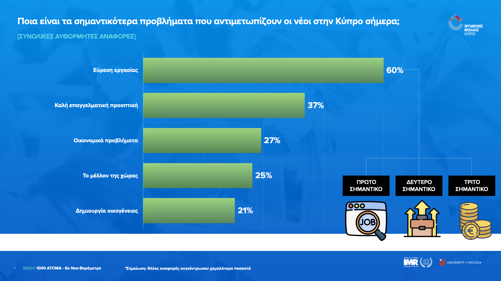 Η εύρεση εργασίας συνεχίζει να αποτελεί τη μεγαλύτερη ανησυχία των νέων, σε ποσοστό 60%. Αξιοσημείωτο είναι το γεγονός ότι σχεδόν 1 στους 4 νέους (37%) προκρίνει ως πρόβλημα την καθιέρωση σε εργασία με καλή επαγγελματική προοπτική. Παράλληλα, 3 στους 10 νέους (27%) αναδεικνύουν τα οικονομικά προβλήματα ως το σημαντικότερο ζήτημα της νεολαίας. Ακολουθούν η ανησυχία και η αβεβαιότητα ως προς το μέλλον (25%) της χώρας και η δημιουργία οικογένειας (21%).